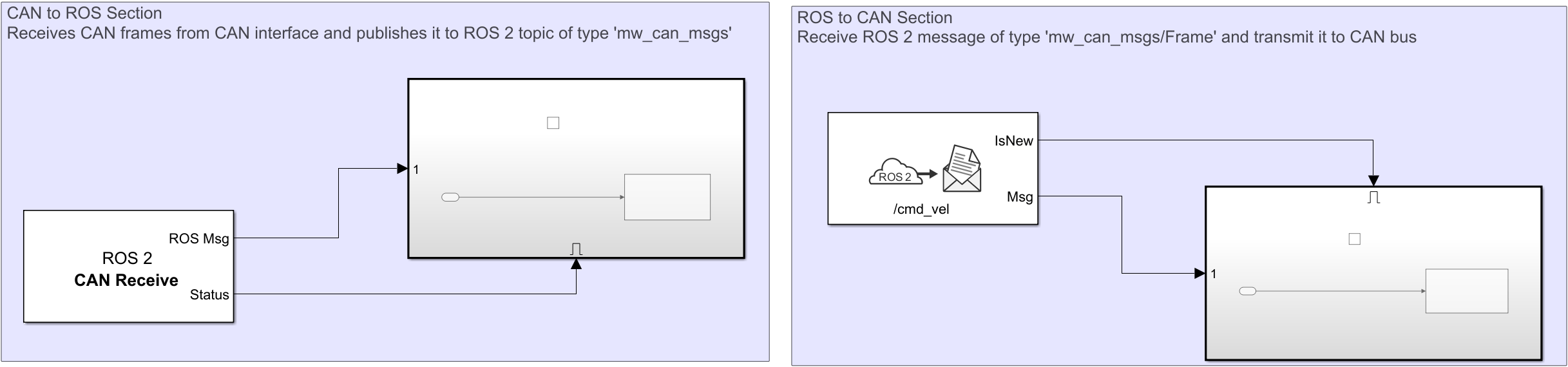 open_system("ROS2CANBridge");This model contains two sections: