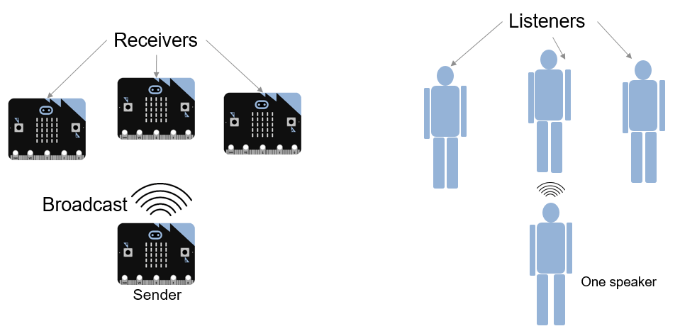 The Radio Transmit block is used to send data from a BBC micro:bit. If one BBC micro:bit is sending data, any number of BBC micro:bit boards in its vicinity can receive the data. In this case, the sender is like one person speaking, each receiver is like one of many people listening.