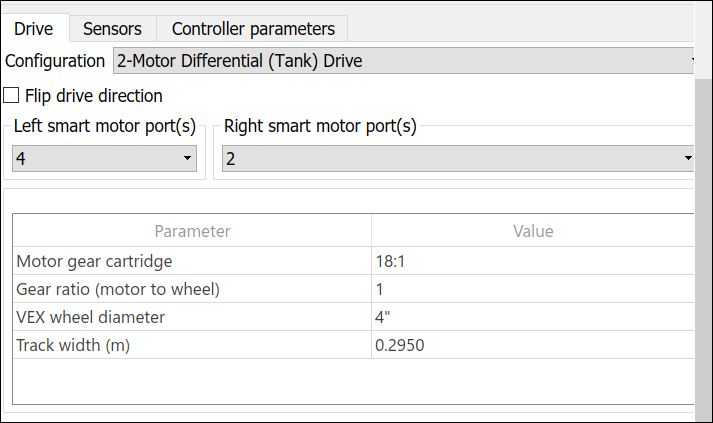 Double-click on the "Differential (Tank) Drive" block to open the block parameters dialog box. For more information on the block parameters, see Differential (Tank) Drive.