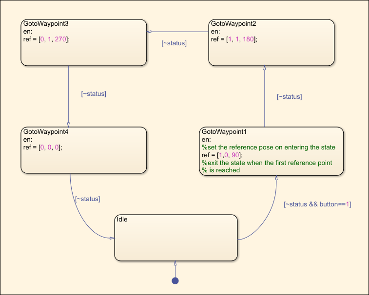 In this example model, the Stateflow chart has 4 waypoints, corresponding to a square path. If you are using this model for the first time, use the default configuration.