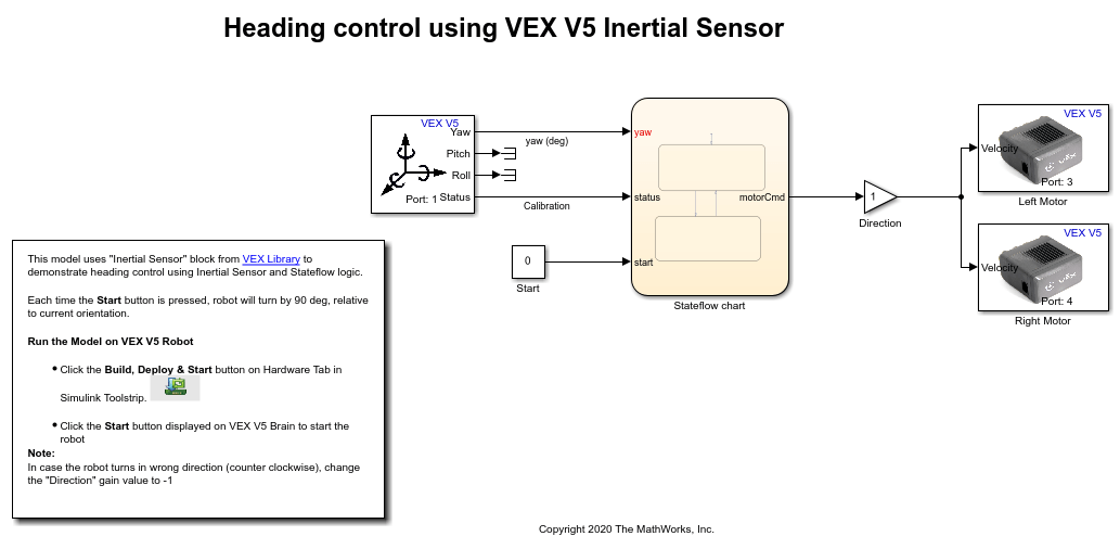 Simulink Coder™ Support Package for VEX EDR V5 Robot Brain provides a preconfigured model that you can use for heading control using VEX V5 Inertial Sensor.