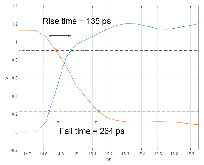 However, when the system behaves nonlinearly, these traditional signal integrity tools cannot accurately or reliably determine system performance. While the LTI assumption holds for many differential communication links, most single-ended communication links exhibit several nonlinearities that complicate analysis. For example, pseudo-open drain transceiver architectures, commonly used in high-speed DDR interfaces, produce rise times that differ significantly from fall times. Additionally, the output impedance of these transmitters depends on the driving state, causing any channel reflections to bounce off the transmitter with a reflection coefficient that varies according to the driving data pattern. An illustration of a system with asymmetrical rise and fall times is shown below: