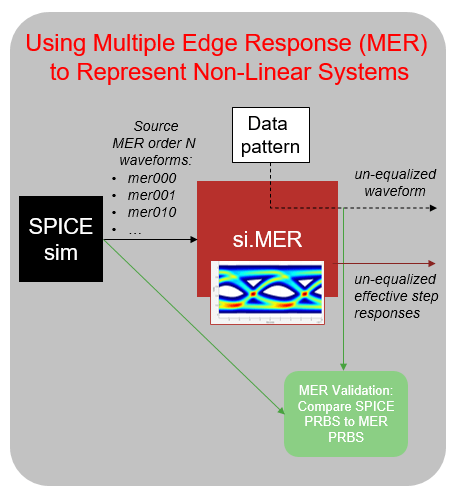 An overview of the example is illustrated below where the SPICE simulation provides the source waveforms from which si.MER calculates the effective step responses needed to reconstruct an arbitrary data pattern and calculate nonlinear statistical eye diagrams. Validation of the MER representation is obtained by comparing the MER reconstruction of a short data pattern with the SPICE simulation of the same data pattern.