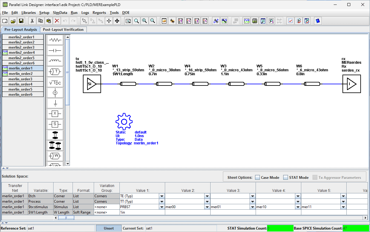 The following image of a Parallel Link Designer project contains a system with a nonlinear transmitter, a short reflective channel, and an ideal receiver. The simple NRZ transmitter has asymmetric rise and fall time as well as an output impedance that is dependent on the driving voltage of the transmitter. This system will allow for a demonstration of the capabilities and power of MER analysis. Each sheet contains a sweep of the stimulus pattern which includes a PRBS 7 pattern and MER source patterns.