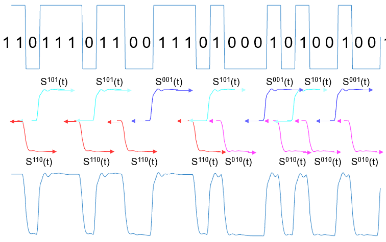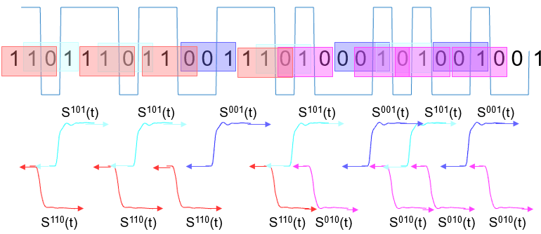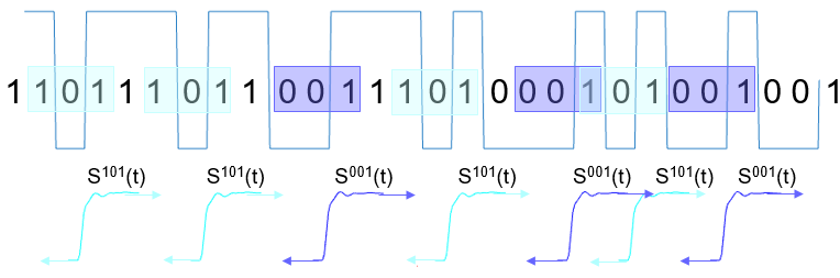 The following illustration demonstrates how to use the MER order 2 effective step responses to reconstruct an arbitrary data pattern. For each rising or falling edge in the pattern, match it with the corresponding effective edge response. Small arrows at the start and end of each step response indicate that these responses extend indefinitely. Begin by identifying the S001(t) edges in the data pattern.
