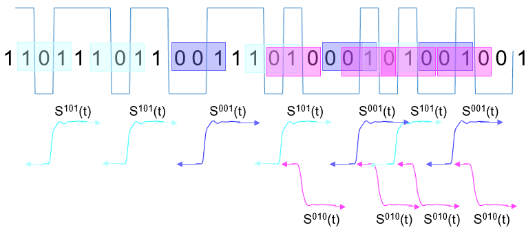Take a closer look at the calculation S101(t)=y101(t)-y100(t). By subtracting y100(t) from y101(t), remove the effect of the prior symbol pattern, 10, from the edge response. This process effectively conditions the step response on the preceding 10 symbol pattern.
