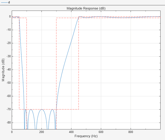 Generate MATLAB function>Digital Filter Object. The code appears in the editor.function designedFilter = bandstopiir1filt designedFilter = designfilt('bandstopiir', ... 'PassbandFrequency1',50,'StopbandFrequency1',100, ... 'StopbandFrequency2',300,'PassbandFrequency2',450, ... 'PassbandRipple1',1,'StopbandAttenuation',70, ... 'PassbandRipple2',1,'SampleRate',2000, ... 'DesignMethod','ellip','MatchExactly','stopband'); end