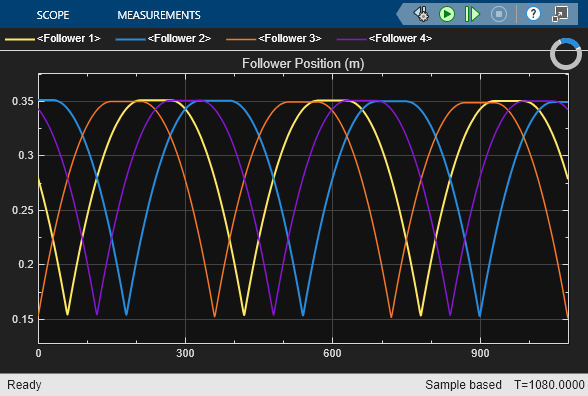 During the simulation, the cams complete three revolutions. The Rotational Motion Sensors wrap the angle between 0 and 360 degrees, making it easier to visualize each revolution in the scope. The scope results also verify the initial angles of each cam.