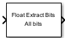 The Float Extract Bits block accepts a signal containing floating-point data and outputs a signal containing the binary representation of the data. For more information on this binary representation, see the IEEE Standard for Floating Point Arithmetic.