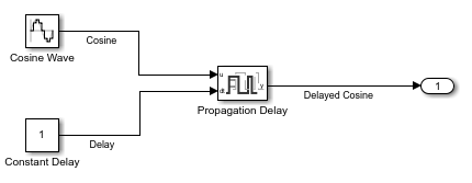 Open the model ConstantPropagationDelay. The model uses a Propagation Delay block to delay the output from a Sine Wave block by a constant value specified using a Constant block. The Sine Wave block is configured with a phase shift of pi/2, so the output is a cosine wave.