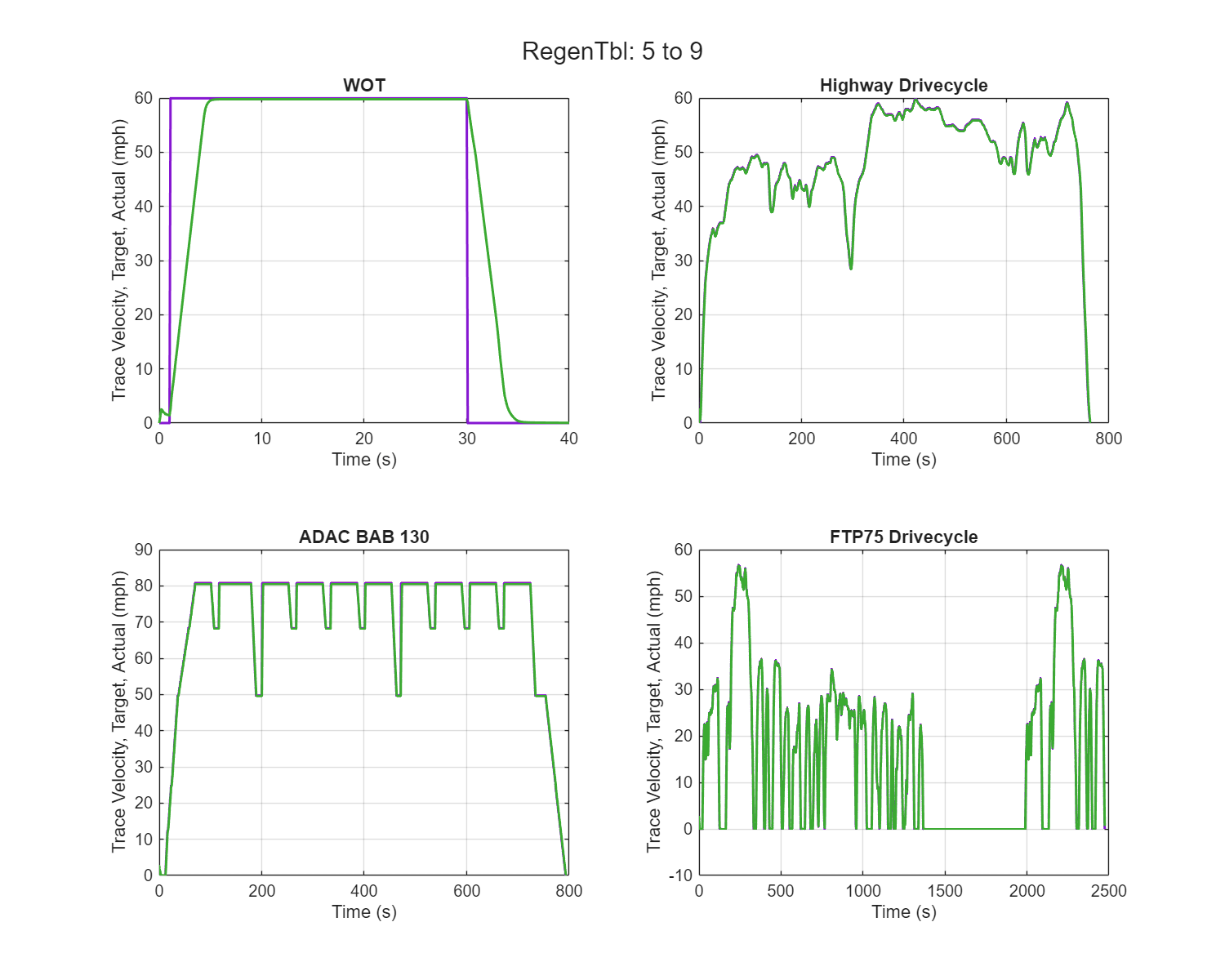 Use the slider to inspect the simulation results to observe the effect different regen lower limit values have on meeting the target velocity for each drive cycle.