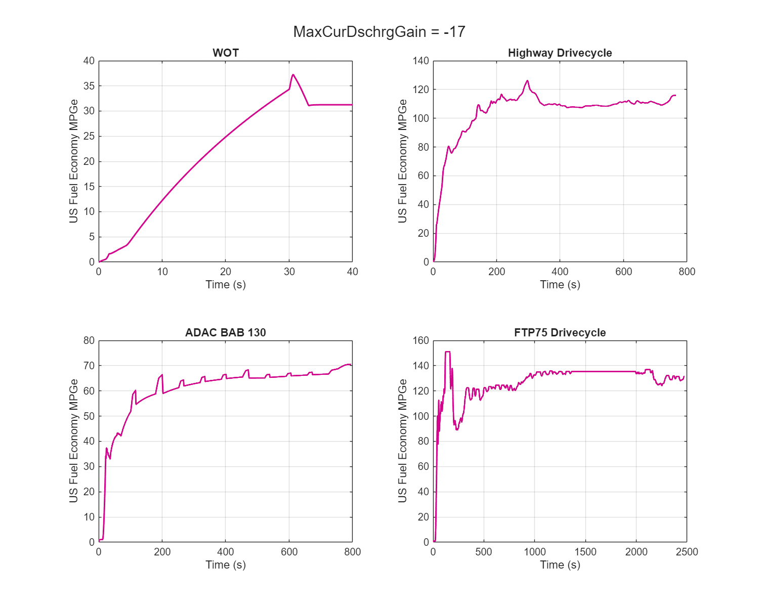 When you inspect the WOT test using the acceleration plot, you can observe the effect the maximum allowable discharge current value has on the vehicle from 0 to 60 mph. As the current discharge value increases, you see a gain in acceleration time. The curves begin to deviate at higher speeds because, at low speeds, you are not limited by current or power, but by how much torque you are allowed to apply to limit wheel speed at launch.