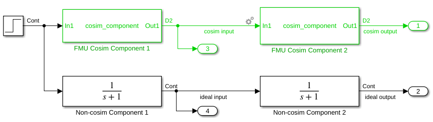After updating the block diagram, a gear icon appears at the input port for the second co-sim component, FMU Cosim Component 2. This indicates that Simulink® has automatically determined that this input port needs numerical compensation because: