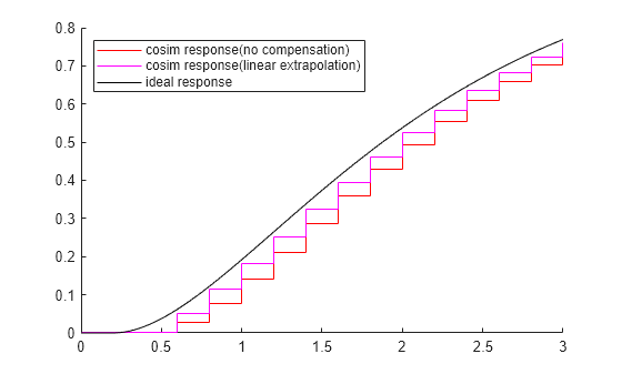 set_param(p.Inport,'CoSimSignalCompensationMode','Auto') out_linear = sim(integrationMdl); figure(2); hold on; plot(out_off.yout{1}.Values,'r') plot(out_linear.yout{1}.Values, 'm') plot(out_off.yout{2}.Values,'black') legend({'cosim response(no compensation)', 'cosim response(linear extrapolation)', 'ideal response'}, 'Location', 'northwest')