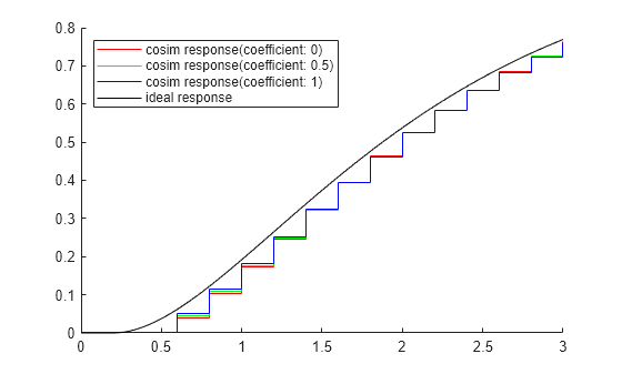 set_param(p.Inport,'CoSimSignalCompensationConfig', '{"ExtrapolationMethod":"LinearExtrapolation", "CompensationCoefficient":"0"}' ) out_linear_0 = sim(integrationMdl); set_param(p.Inport,'CoSimSignalCompensationConfig', '{"ExtrapolationMethod":"LinearExtrapolation", "CompensationCoefficient":"0.5"}' ) out_linear_0_5 = sim(integrationMdl); set_param(p.Inport,'CoSimSignalCompensationConfig', '{"ExtrapolationMethod":"LinearExtrapolation", "CompensationCoefficient":"1"}' ) out_linear_1 = sim(integrationMdl); figure(4); hold on; plot(out_linear_0.yout{1}.Values,'r') plot(out_linear_0_5.yout{1}.Values, 'g') plot(out_linear_1.yout{1}.Values, 'b') plot(out_off.yout{2}.Values,'black') legend({'cosim response(coefficient: 0)','cosim response(coefficient: 0.5)','cosim response(coefficient: 1)','ideal response'},'Location','northwest')