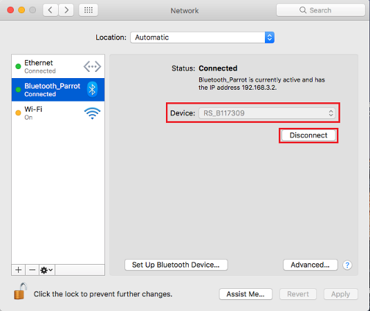 Browse to System Preferences > Network > Bluetooth_RS and click the Set Up Bluetooth Device… button. Your computer searches for all the Bluetooth-enabled devices in its range. Wait a few seconds for the minidrone to appear.