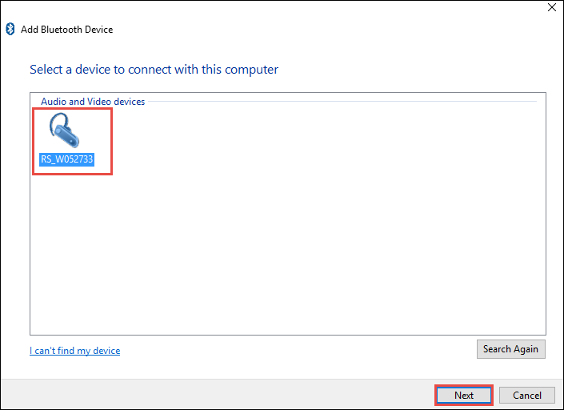 The minidrone must appear within a few seconds after you click Add Device > Audio /Video Device. If not, click the Search Again button to scan for the Bluetooth-enabled devices again.