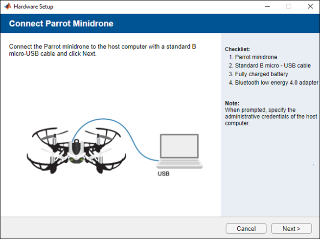 Complete the steps on the screen of Hardware Setup. Connect the minidrone using USB to the system: