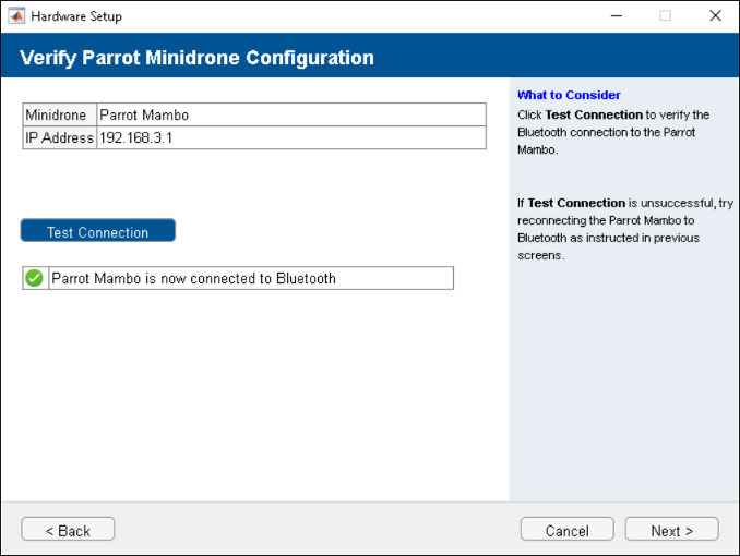 Once the minidrone is connected to the Windows® system over Bluetooth® PAN, we need to set the IP for the system to communicate with the minidrone.