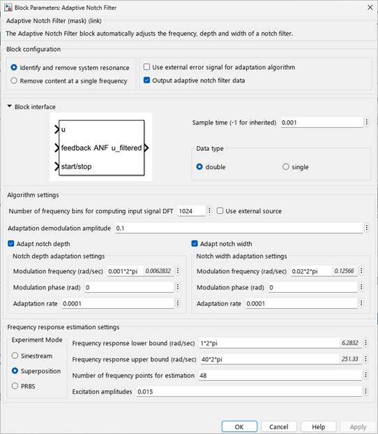 The block in this model adapts both the notch depth and width based on the identified resonance. The following image shows how the block is configured.
