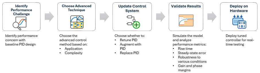 Sometimes with a baseline PID design, you may face performance issues based on several concerns. To address such issues, you can use advanced control techniques from Simulink® Control Design™ software to augment your baseline PID control system.