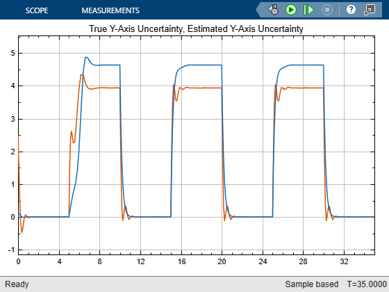 The controller estimates an accurate y-axis uncertainty model. The uncertainty model for the x-axis has the correct sign, though the magnitude is lower than that of the true uncertainty. Both uncertainty models show significant transients in the uncertainty estimate, especially during the first step change in the reference signals.