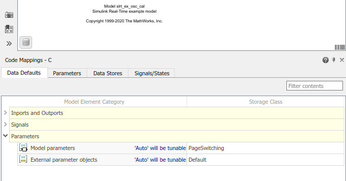 3. In the Code Mappings Editor — C in Data Defaults, specify the storage class as PageSwitching for Model parameters under Parameters.