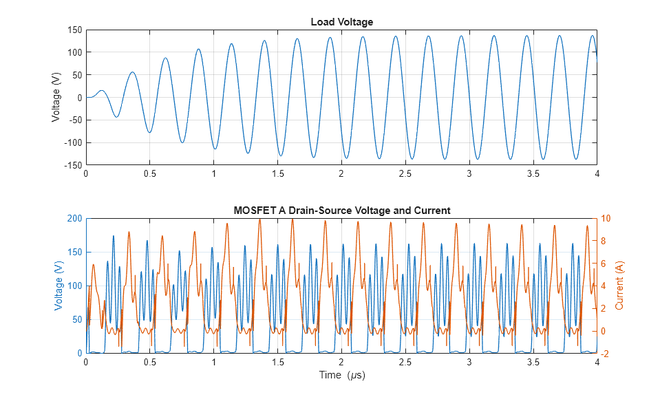 The plot below shows the load voltage and the drain-source voltage and current for MOSFET A.
