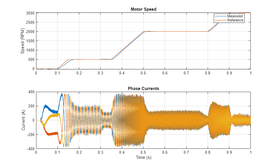 This example shows how to control the rotor angular velocity in an interior permanent magnet synchronous machine (IPMSM) with an open-end winding. A high-voltage battery feeds the IPMSM through two controlled three-phase converters. The IPMSM operates in both motoring and generating modes according to the load. An ideal torque source provides the load. The Scopes subsystem contains scopes that allow you to see the simulation results. The Control subsystem includes a PI-based field oriented control structure. During the one-second simulation, the angular velocity demand is 0 rpm, 500 rpm, 2000 rpm, and then 3000 rpm.