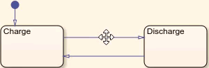 The chart places a default transition on the first state you add to the canvas. In this example, the default transition connects to the Charge state. You can add other default transitions from the palette by clicking the default transition icon and clicking the edge of a state.