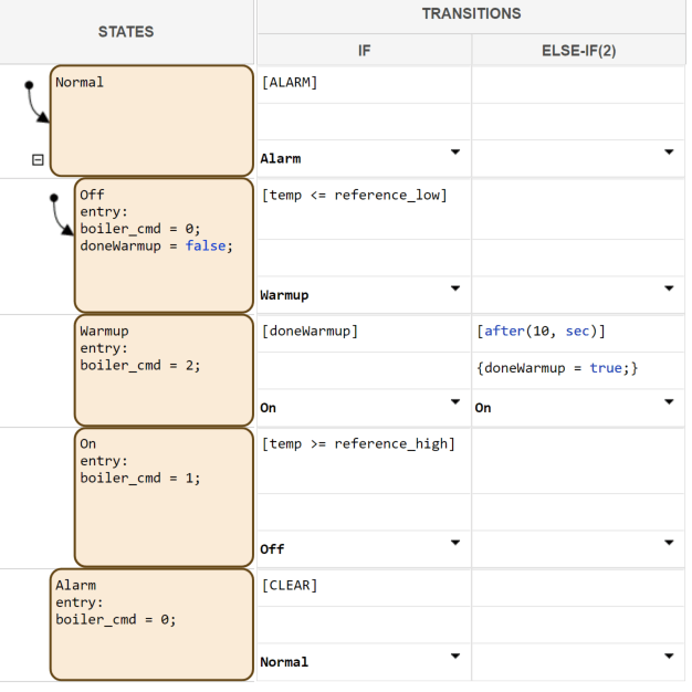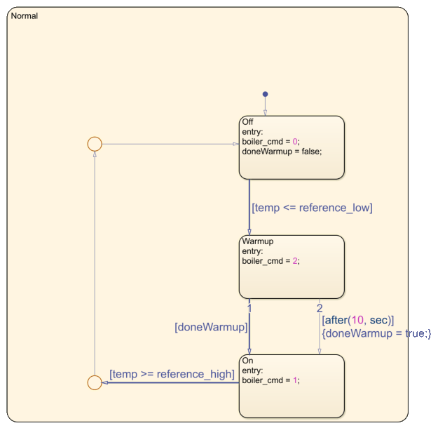 In this example, a state transition table contains the logic for maintaining the temperature of a boiler between two set points, reference_low and reference_high. During normal operation, the boiler cycles between the states Off, Warmup, and On. For more information on this example, see Model Bang-Bang Controller by Using a State Transition Table.