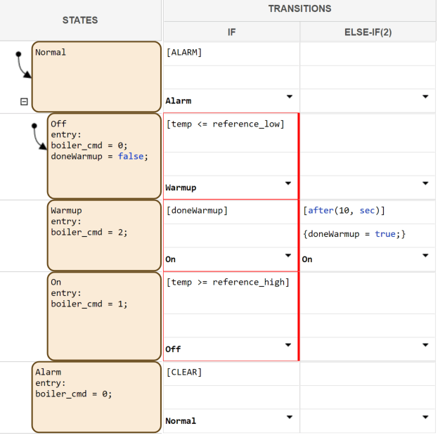To mark a sequence of transitions that represent the primary flow of logic in your state transition table, right-click each transition cell and select Mark as primary transition. For example, you can mark the transitions between the Off, Warmup, and On states that describe the normal operation of the boiler. A red border indicates the primary transition cells.