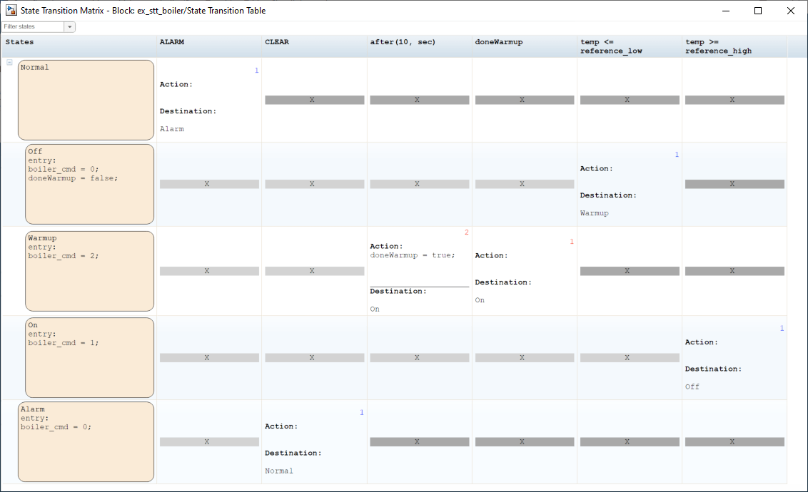 • Each row represents a state in the state transition table. The states appear in the same order as in the state transition table. To see only a subset of states, in the upper-left corner of the State Transition Matrix window, in the Filter states box, enter a state name or select a name from the drop-down list.