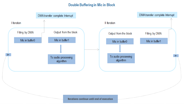 In the first iteration, when the ‘Mic in buffer1’ sends the data for audio processing, the DMA fills ‘Mic in buffer0’.