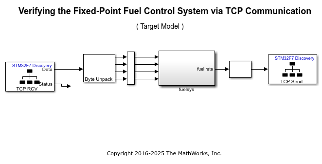 In this task, you will run the Model Fault-Tolerant Fuel Control System example on the STM32F746G Discovery board. The control algorithm runs on the target while the host runs a plant simulation of the system. The target and the host communicate via TCP. The target model receives the fuel system control sensors values from the host model and transmits back the calculated fuel mixture ratio to the host computer.