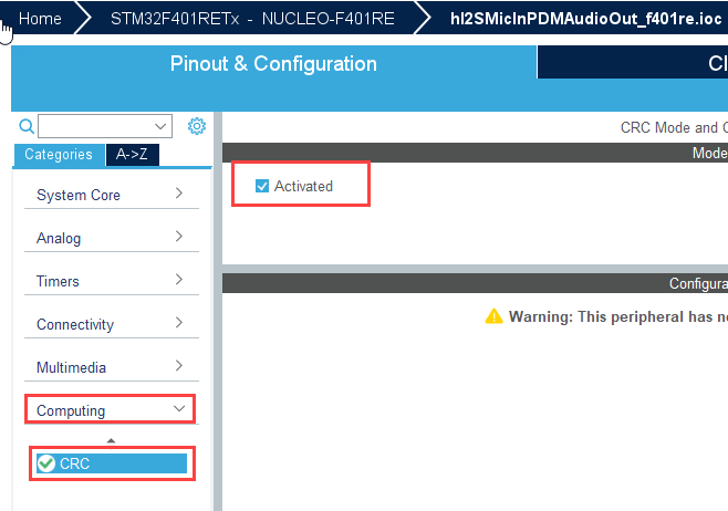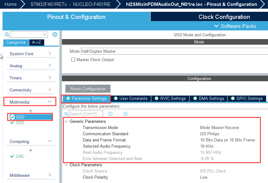 Click Launch from Configuration Parameters to open the hI2SMicInPDMAudioOut_f401re.IOC file in the STM32CubeMX tool.