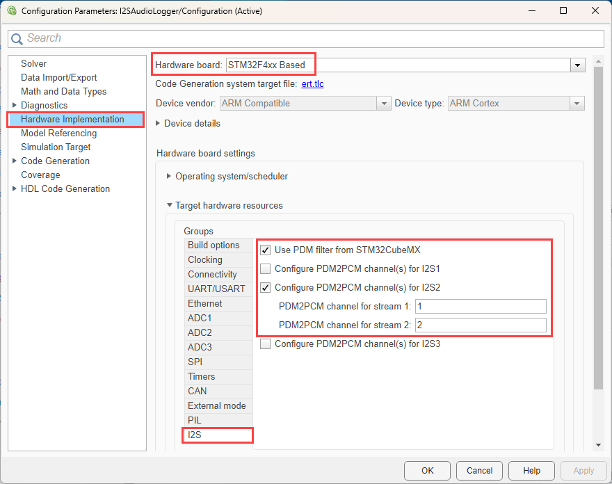 In the I2SAudioLogger.slx target model, configure the I2S2 peripheral to stereo transmission with signal format set to 16-bits.