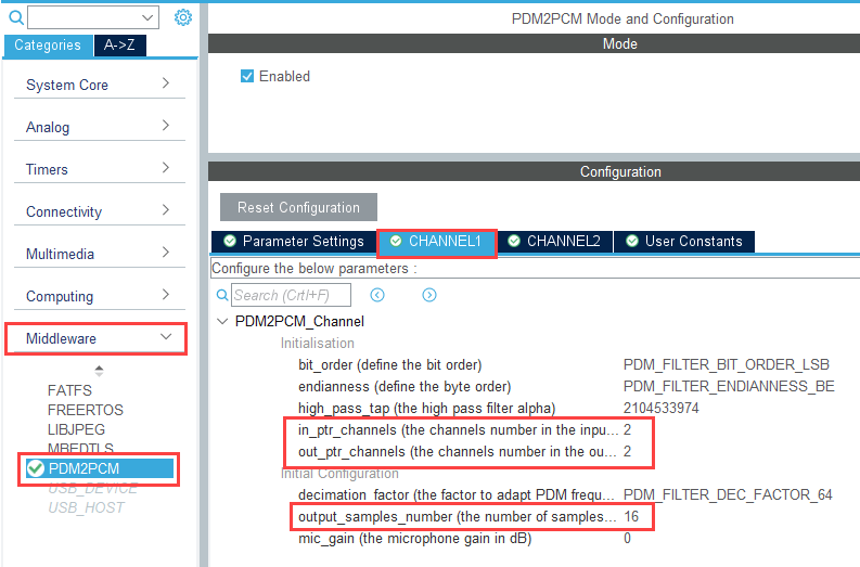 Specify the PDM2PCM channels that you configure in CubeMX for the corresponding I2S modules in the Configuration Parameters.