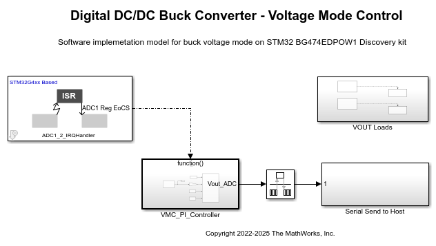 Using this model you will learn how to regulate the synchronous buck converter power stage as available on the onboard B-G474E-DPOW1 Discovery kit in voltage-mode control and its implementation using the STMicroelectronics® ARM® Cortex®-M4 core-based STM32G474RET6 microcontroller.