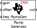 This block generates ramp output (out) from the slope of the ramp signal (gain), DC offset in the ramp signal (offset), and frequency of the ramp signal (freq) inputs. All of the inputs and output are 32-bit fixed-point numbers with Q values between 1 and 29.