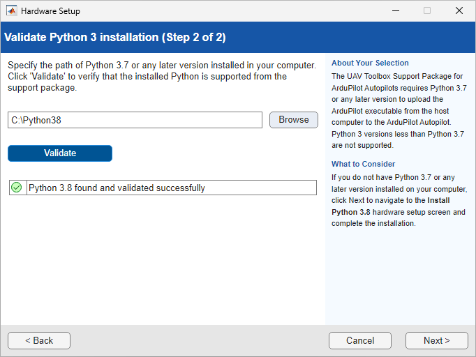 After you provide the path where Python 3.7 or later is installed. Click Validate. Upon successful validation, you can move to subsequent hardware setup screens.