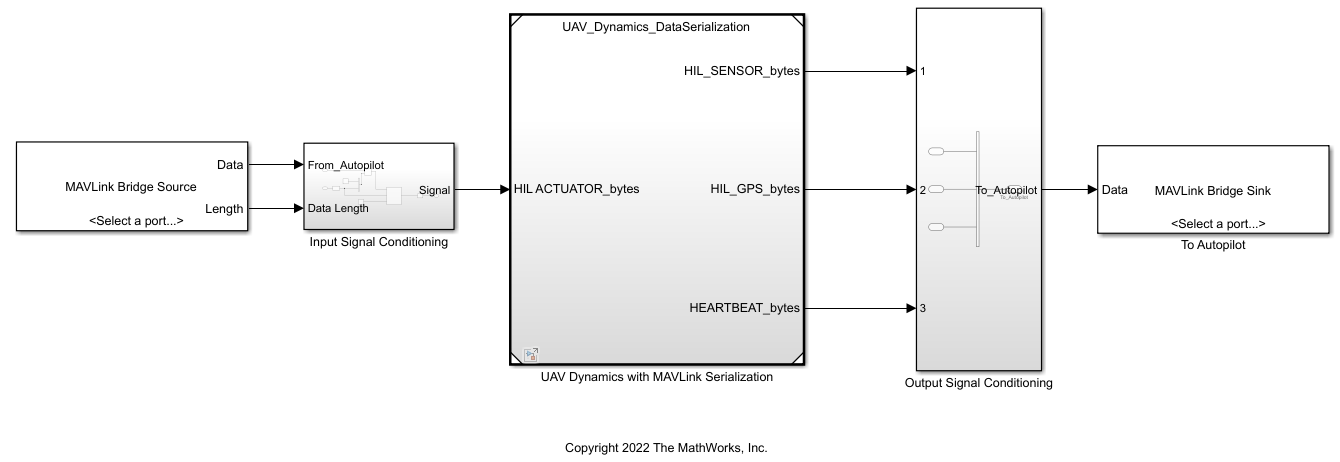 7. In the Simulink plant model, set the serial ports in MAVLink Bridge Source and MAVLink Bridge Sink blocks.