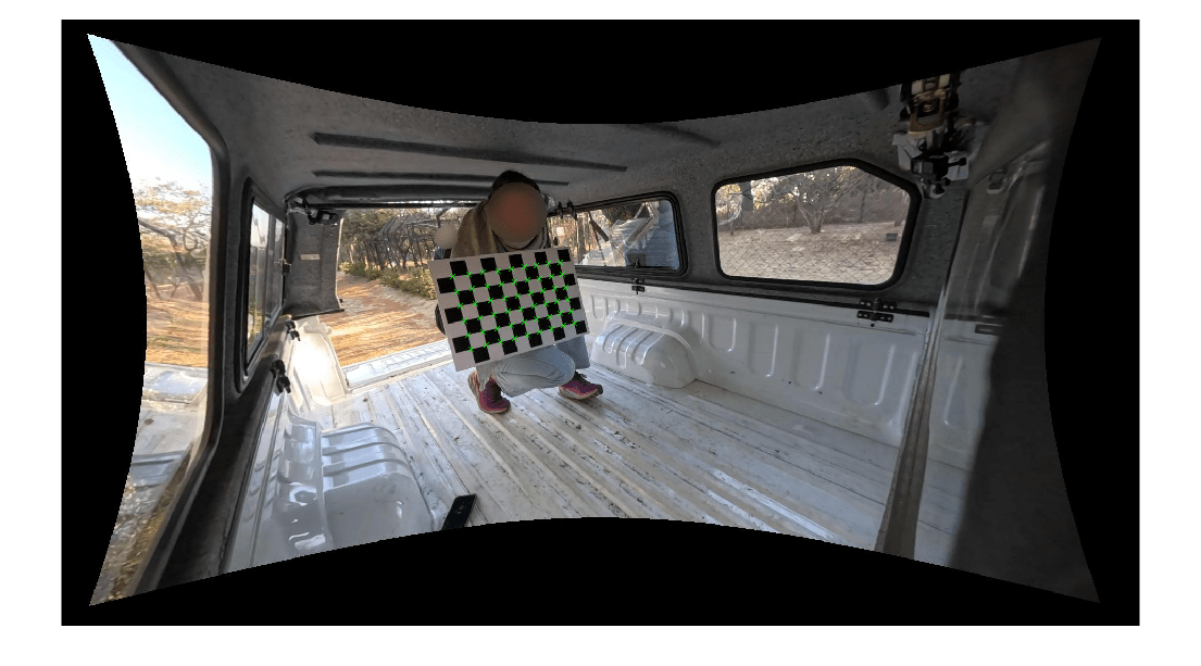 Estimate the intrinsic parameters of each camera to remove image distortion and to determine the relative camera poses. In this example, the four cameras were individually calibrated with a checkerboard calibration pattern Using the Single Camera Calibrator App, and the four fisheyeIntrinsics objects were saved to four-gopro-intrinsics.mat.
