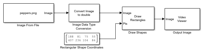 The Draw Shapes block overwrites the value of each pixel in the specified rectangular areas of the original image.