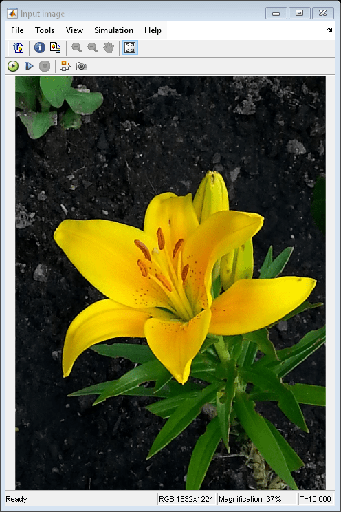 This model reads an input image using an Image From File block with the File name parameter set to yellowlily.jpg.