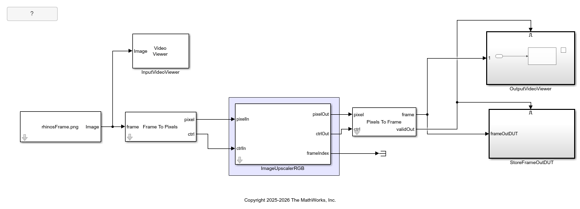 This example shows how to upscale a multicomponent image by a factor of two by using a 5-tap interpolation filter. The algorithm is designed for implementation on FPGAs.