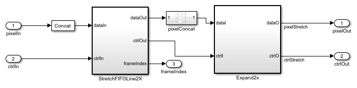Because the output frame is four times the size of the input frame, the DUT operates at a lower rate than the input stream. This difference in rates can result in frame loss from the input stream. The DUT does not support control buses with noncontiguous valid signals, multipixel input streams, or images with an odd number of ActivePixelsPerLine or ActiveVideoLines.