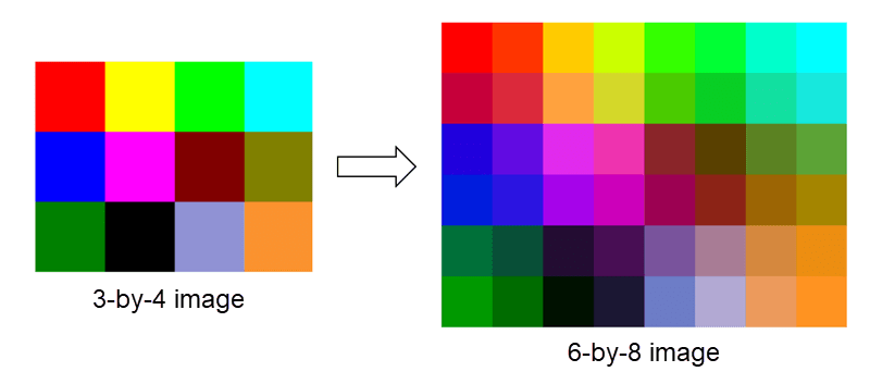 This diagram shows the pixel mapping and upscale of a 3-by-4 image into a 6-by-8 image.