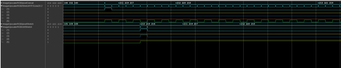 The StretchFIFOLine2X subsystem stretches the horizontal line to accommodate a new interpolated pixel between each two existing pixels. Because the output depends on the neighboring pixels, the DUT contains delay blocks to align the data with control signals. This waveform shows the modified control signals of the stretched input lines.