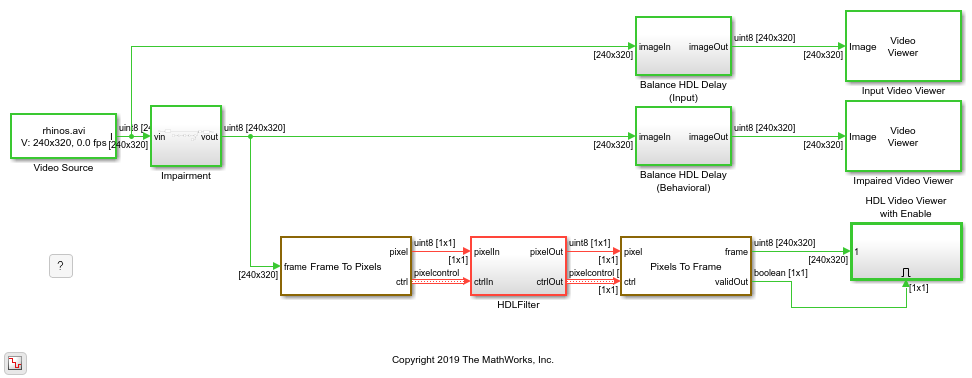 The example model applies a brightness impairment to the input video, and the HDL Filter subsystem calculates filter coefficients for each frame and corrects the impairment. The model includes three video viewers: one for the original input video, another for the impaired video, and the third for the result of the filter that counteracts the impairment.
